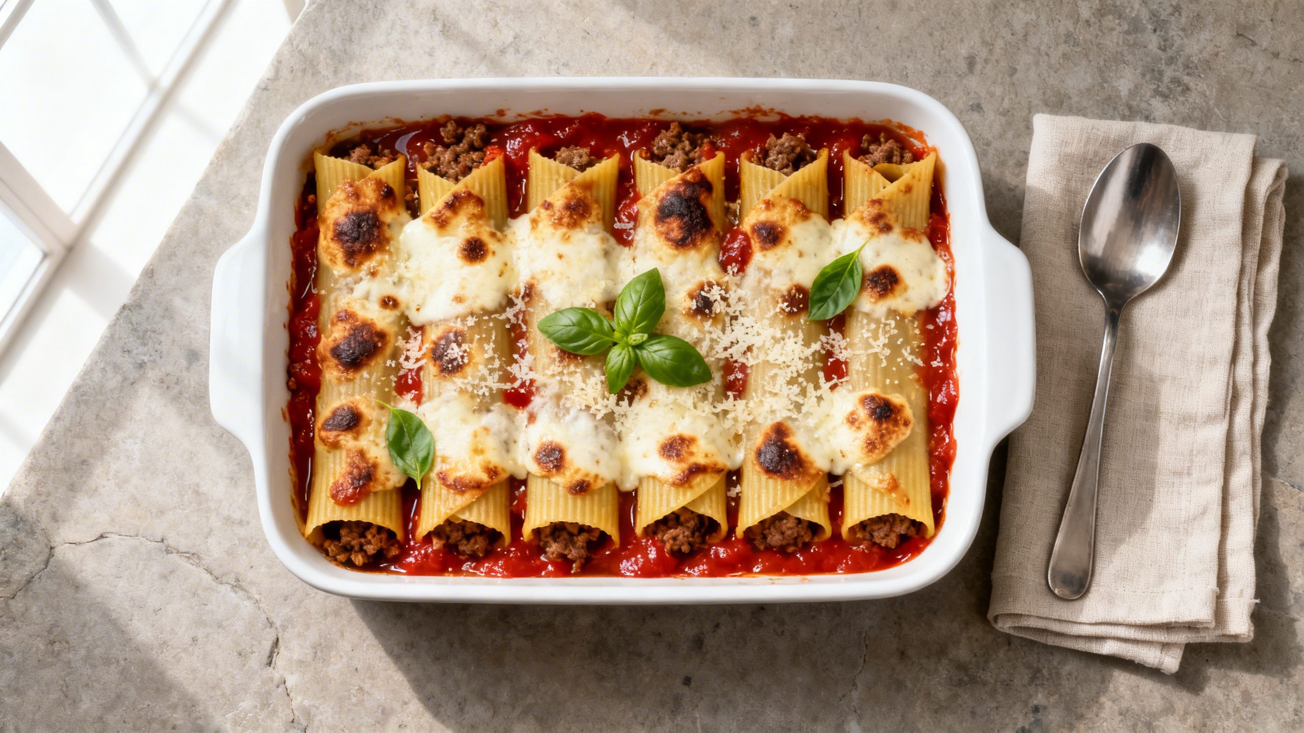 Tender manicotti shells stuffed with herbed beef and three cheeses, layered with marinara, and baked until bubbly and golden.